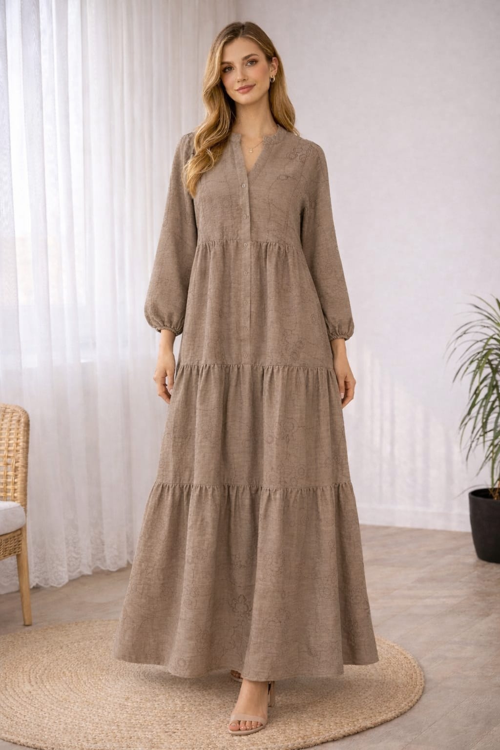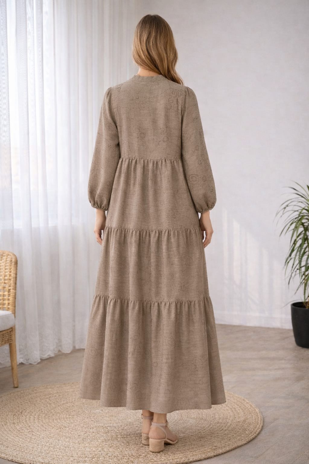 - Yetişkin kadınlar için tasarlanmış, tesettür giyim tarzına uygun uzun elbise.